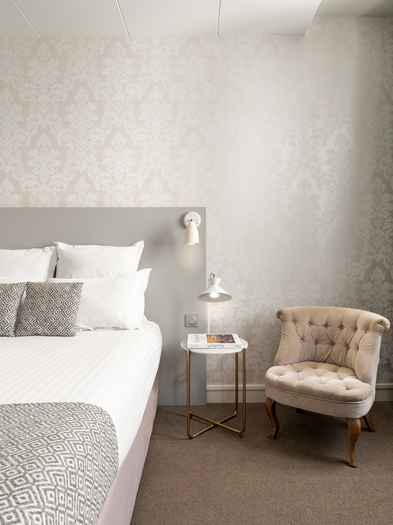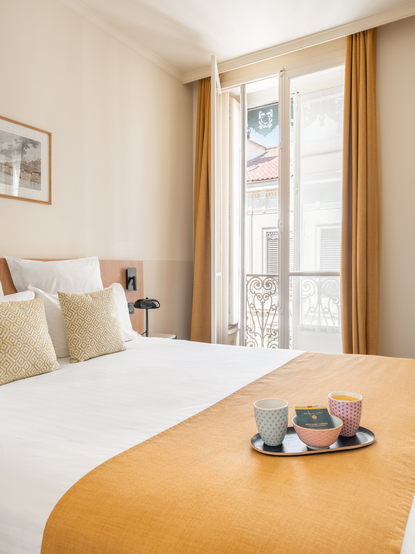 La chambre Privilège est une véritable nid douillet, avec ses 22 m², elle est idéale pour les familles ou les voyageurs en quête de plus de liberté, cette chambre est équipée soit d’un lit Queen size (160 cm), soit d’un lit King size (180) twinable que vous pouvez séparer en deux lits simples sur demande. Pour encore plus de flexibilité, nous disposons dans cette catégorie de chambres triples avec 3 lits sur demande. Chaque chambre combine harmonieusement le charme ancien de notre hôtel historique et des touches de modernité pour créer une atmosphère chaleureuse et accueillante. Ajoutez une bouilloire avec une sélection de thés pour une pause bien-être après une journée de visites à Lyon et le tour est joué !