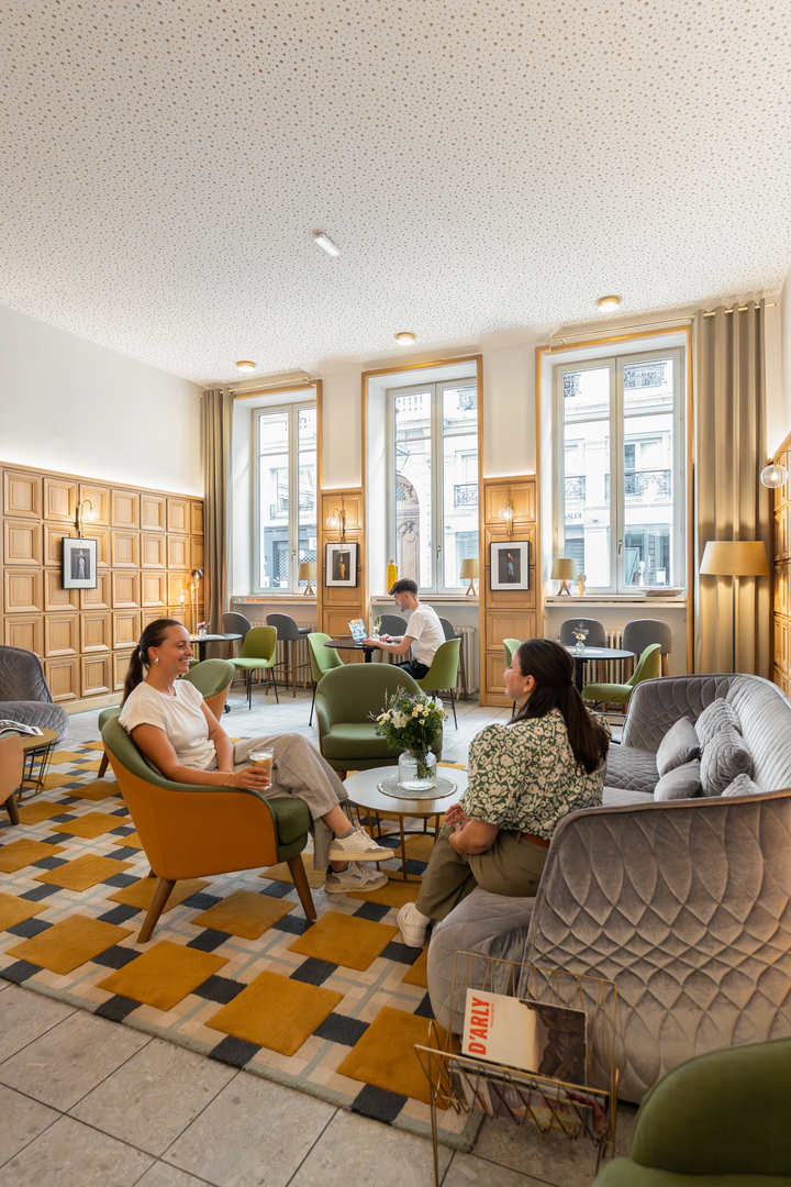 Dès que vous poussez la porte rue Gasparin, le lobby vous enveloppe dans un décor singulier, à la fois feutré et lumineux, où le bois chaleureux dialogue avec le velours des canapés. Au mur, des tableaux, aussi grotesques qu’attachants qui ne peuvent que vous tirer un sourire. Ce lieu de 60m² semi-privatisable vit au rythme des rencontres et des inspirations. Du matin au soir, on y sirote un café, échange un sourire complice ou savoure un tea time en famille. C’est l’espace de coworking par excellence.tout en plein cœur de Lyon.